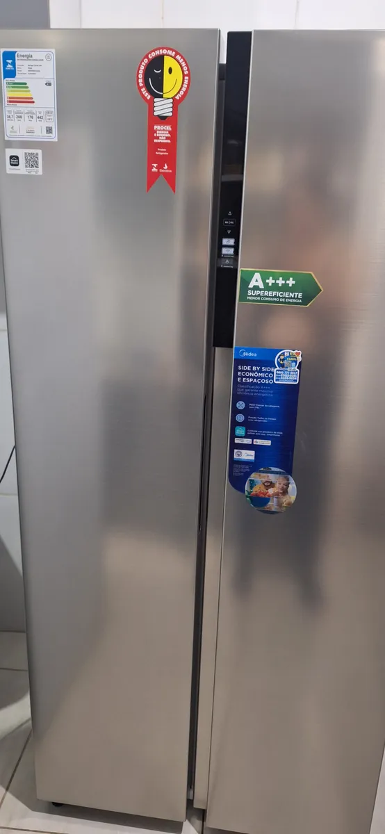 O refrigerador Side by Side 442L Midea é ideal para sua cozinha. Com classificação energética A+++, oferece eficiência e economia. Seu espaço interno é amplo, incluindo um freezer de alta capacidade com 176L. Conta com conectividade via aplicativo, permitindo o controle remoto. Dispõe de um painel touch para ajuste das funções, prateleiras de vidro que proporcionam estabilidade para latas e garrafas, e dupla gaveta para frutas e legumes, facilitando a organização dos alimentos.